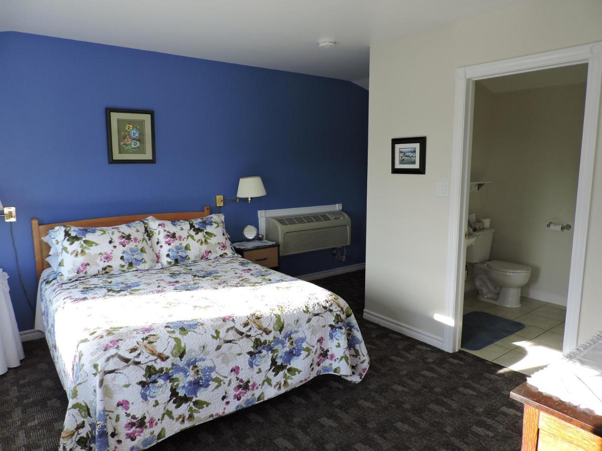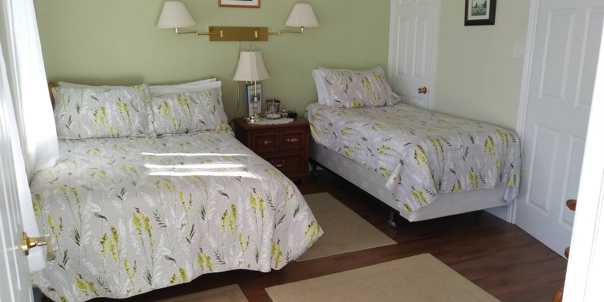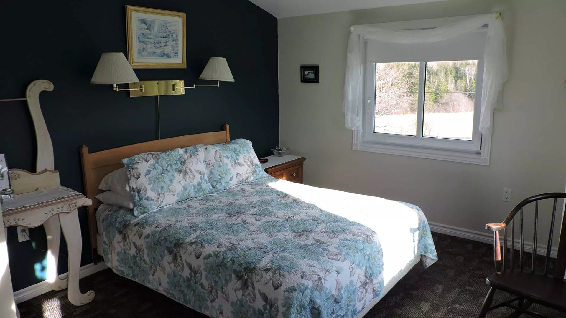 Bedroom #3 is a 13′ x 11′ accessible space designed to meet Canada Access Level 1 standards, ensuring comfort for all guests. The 10′ x 6′ en-suite bathroom includes a barrier-free shower/tub, toilet, and washbasin. Furnished with a double bed and a twin/single bed, it accommodates multiple guests. Ramps provide easy access to the room and main house, with nearby parking for convenience. An air-conditioner/heater unit and compact closet add practicality and comfort.